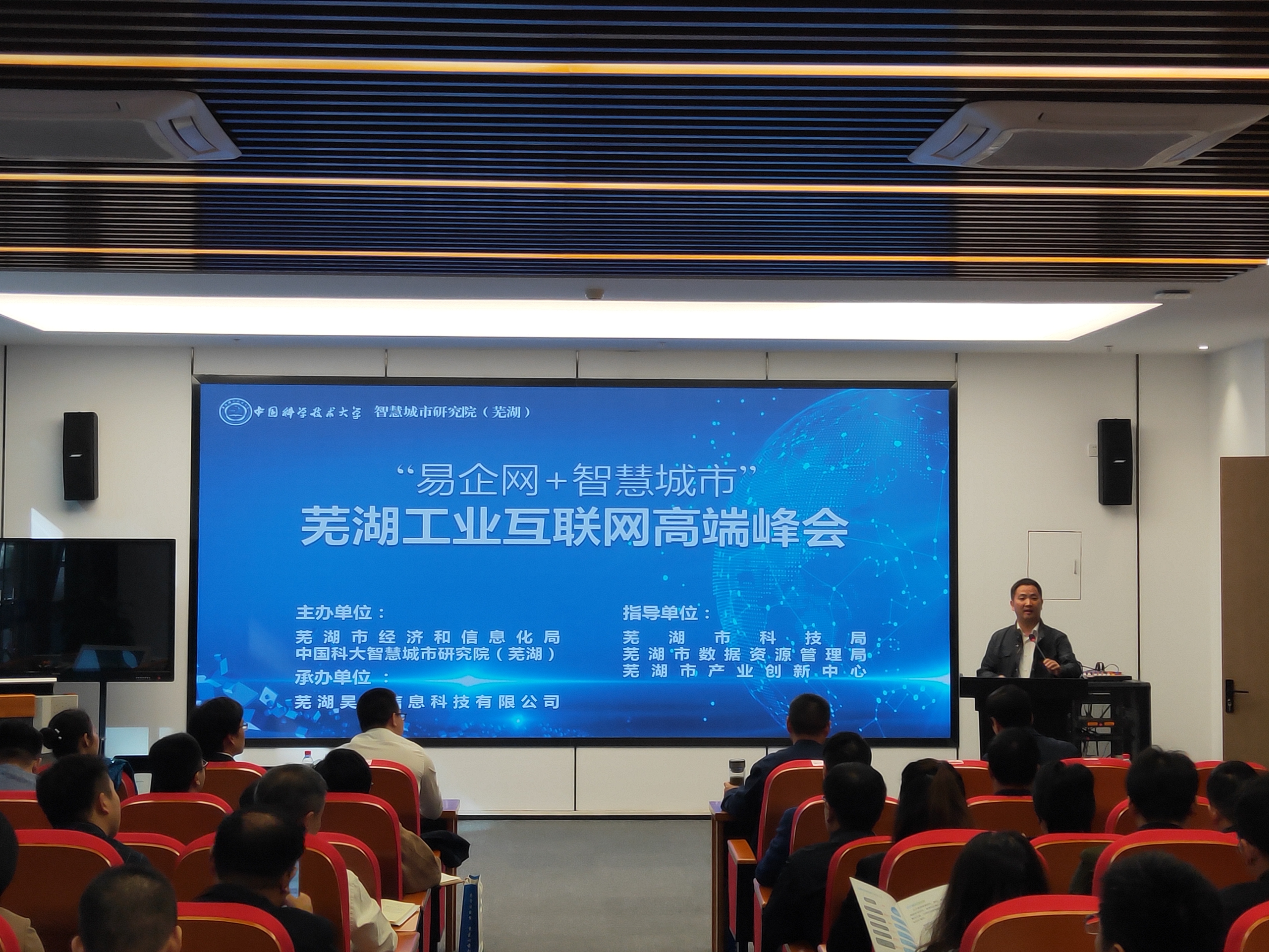 2019年11月1日,由芜湖市经信局和中国科大智慧城市研究院(芜湖)共同主办的“易企网+智慧城市”——芜湖工业互联网高端峰会在芜湖市企业服务中心召开。来自芜湖市的70多家重点制造业和网络信息技术企业负责人,以及芜湖市发改委、市科技局、市数据资源局、市产创中心等有关单位负责领导参加会议。市经信局局长季学敏出席会议,副局长陈传宏致辞。
